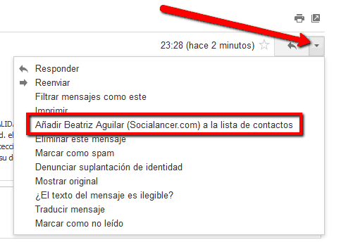 Por ejemplo, en el caso de Gmail les podrías decir que añadieran tu dirección a su lista de contactos pulsando sobre el desplegable que encontrarán en la parte superior derecha del email tuyo que hayan recibido, como en la imagen: