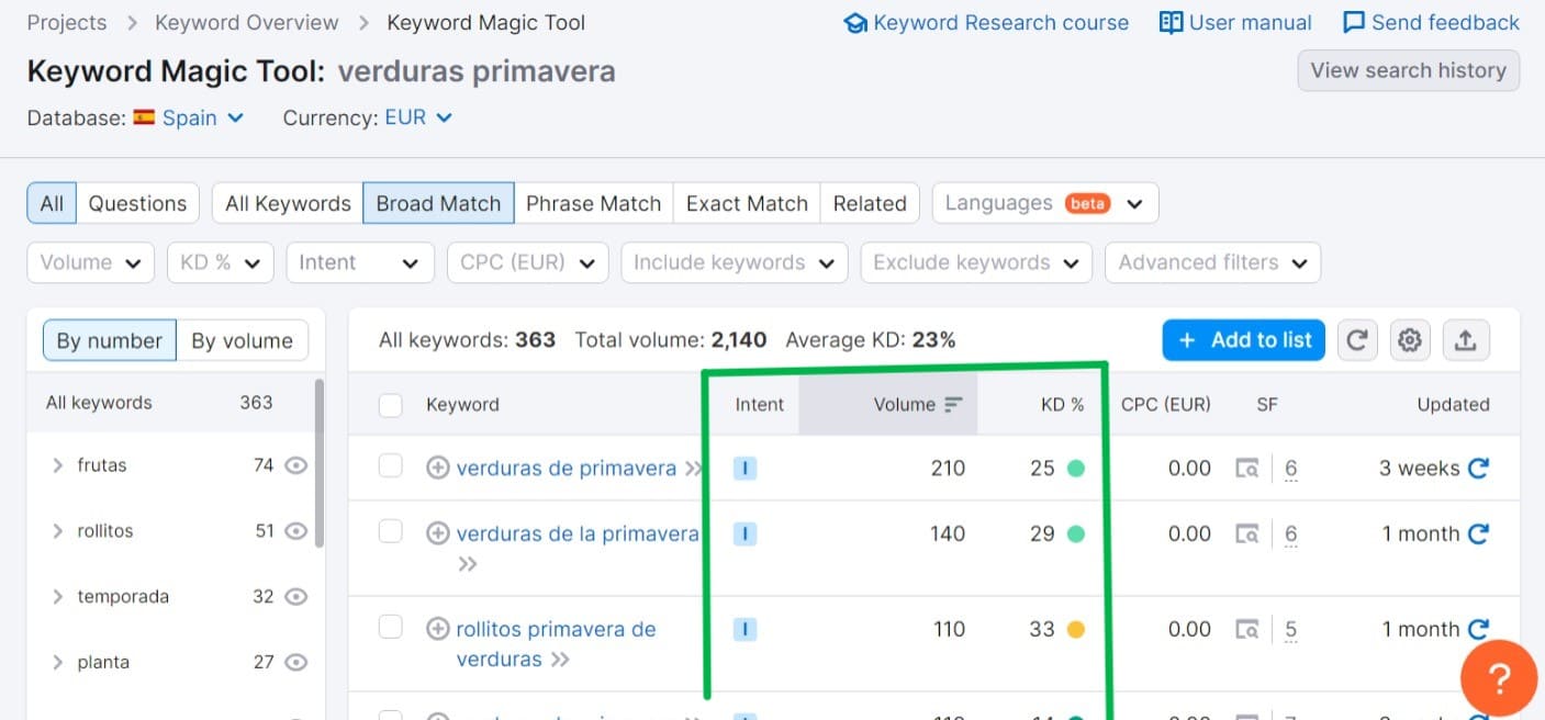 La herramienta mostrará un listado de palabras donde detalla la intención de búsqueda, volumen y dificultad.
