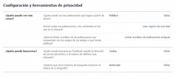 La configuración de esta imagen es la que probablemente más te conviene (puedes editarla en “Configuración de la privacidad”, esquina superior derecha):