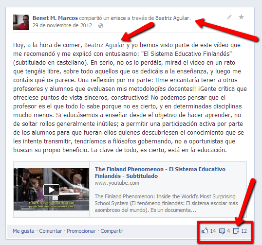 Como habrás notado, en muchas imágenes he destacado en rojo la sección de “Me gusta”, Comentarios y Compartir. Como te decía, he querido ilustrar este post con ejemplos propios -y recientes-, pues se trata de trabajar lo profesional desde lo personal, pero evidentemente hay gente que consigue mucha más interacción por distintos factores: son más conocidos, tratan temáticas de mayor interés común, tienen una comunidad mayor de suscriptores, un grupo de amigos más cohesionado o sencillamente emplean un tono más adecuado.