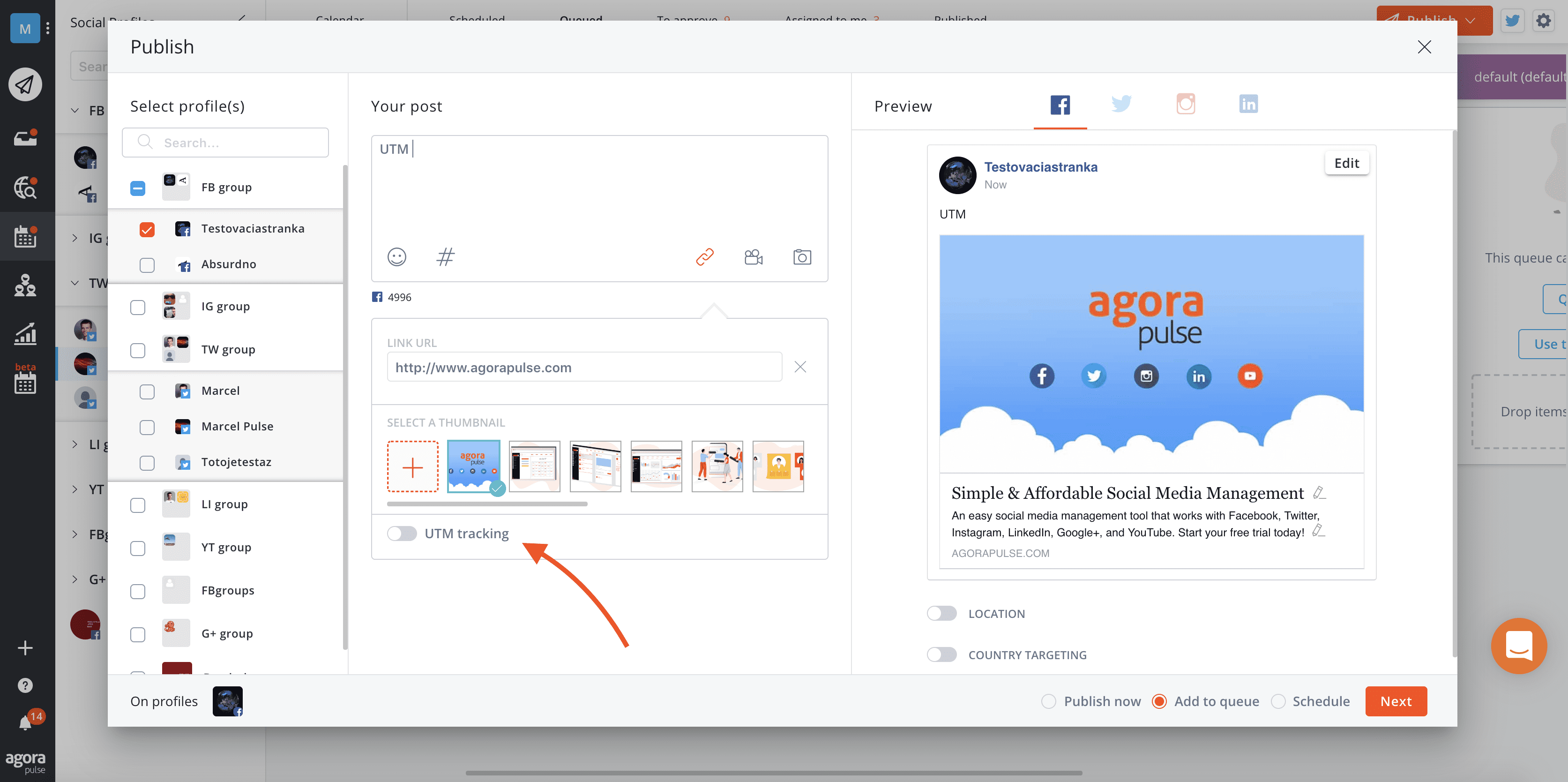 Cuando programas un post en Agorapulse, el planificador de redes sociales te permite agregar una url UTM.