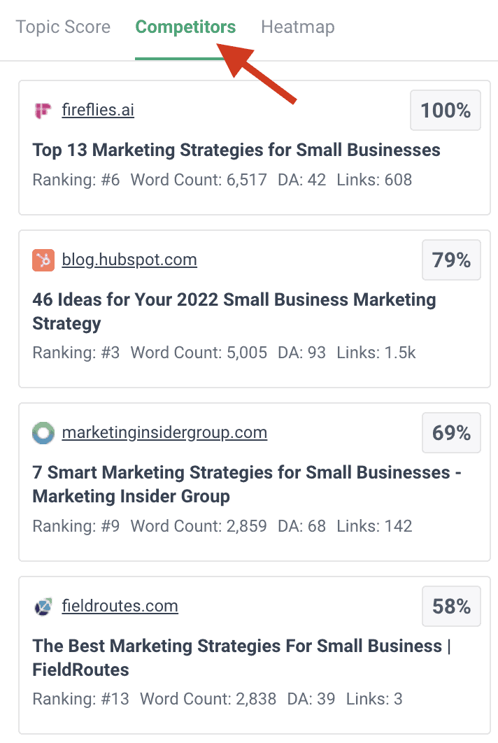 La segunda pestaña es la de Competitors. Con base en los competidores mejor posicionados, la herramienta indica cuánto debes mencionar una keyword para ubicarte entre los 5 mejores resultados.