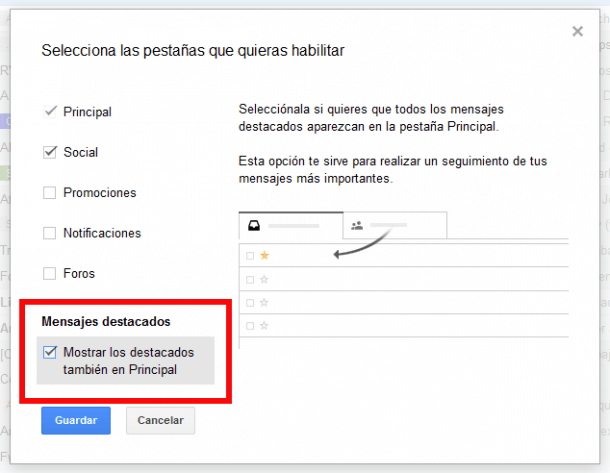 - Marca con una estrella (favoritos o destacados) el email que te interesa para que todos los de ese remitente aparezcan en la pestaña principal (debes tener marcada la casilla de “Mostrar los destacados también en Principal”).