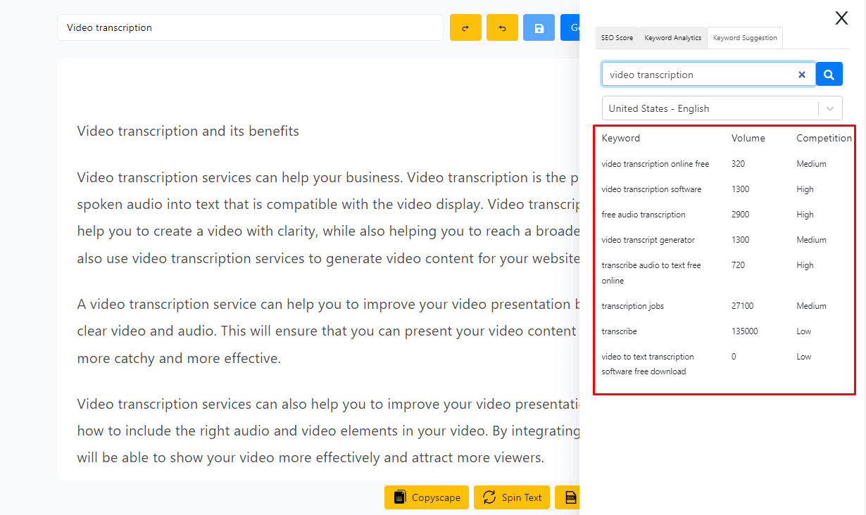 Por último, tiene una herramienta llamada Keyword Suggestion. Lo que hace es sugerir variaciones de la palabra clave ya sea para que agregues palabras clave secundarias o para que directamente modifiques tu palabra clave principal.