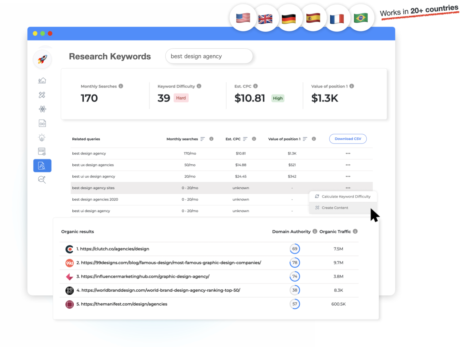 - Búsqueda de keywords SEO para conocer el volúmen de búsqueda mensual, dificultad de la palabra clave para posicionar y su competencia.