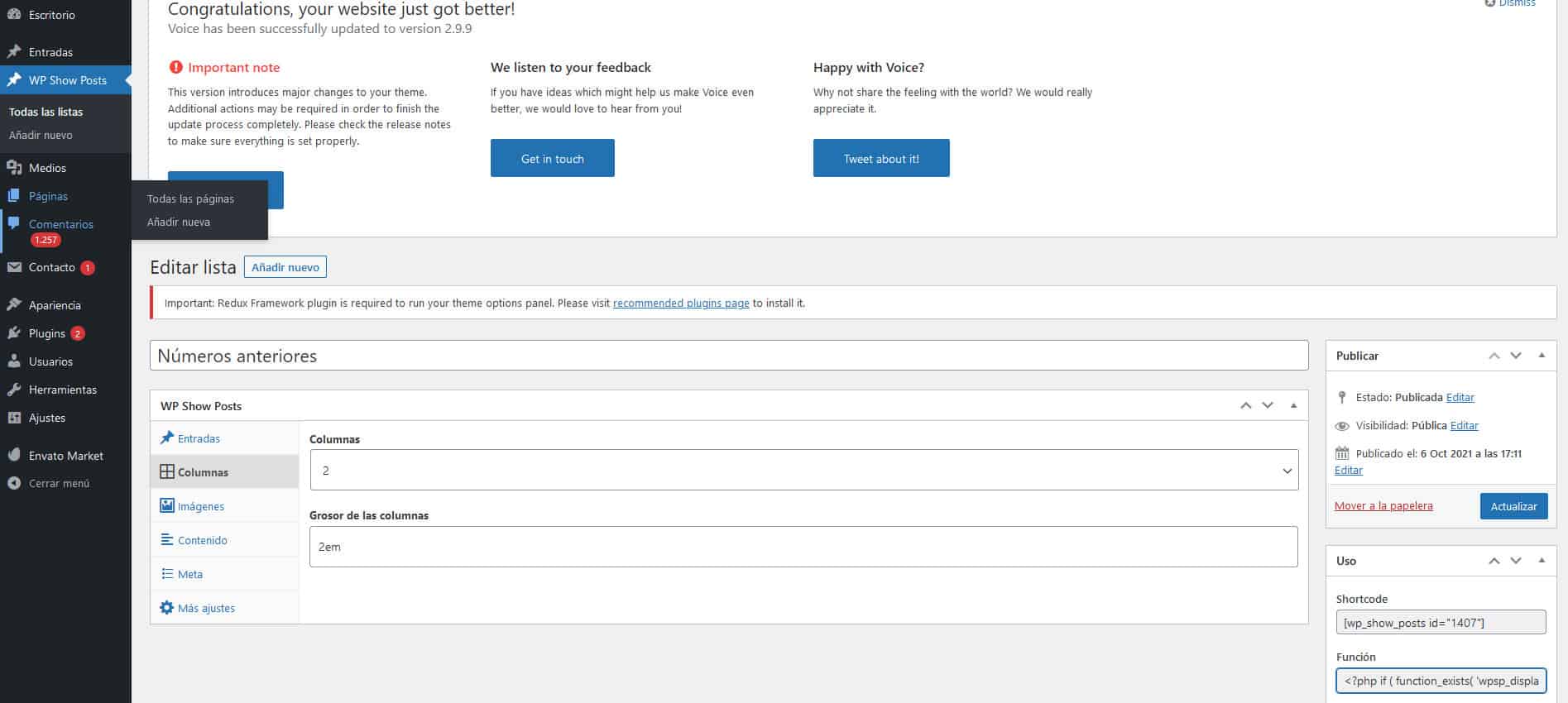 Y una vez lo tengas todo definido, podrás usar simplemente el código que te proporciona tras crear y configurar la lista, por ejemplo [wp_show_posts id=”1407″]. También puedes añadir un código diferente para la misma función en el caso de que necesites añadirlo en un archivo PHP. Por ejemplo : <?php if ( function_exists( ‘wpsp_display’ ) ) wpsp_display( 1407 ); ?>